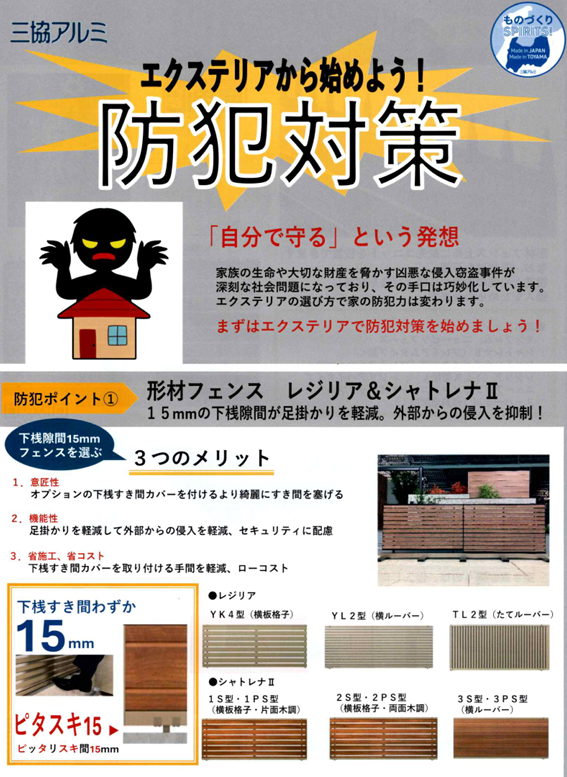 三協アルミさんの防犯対策のご紹介です! 足をかけられないように、下桟隙間はわずか15mmの形材フェン […]