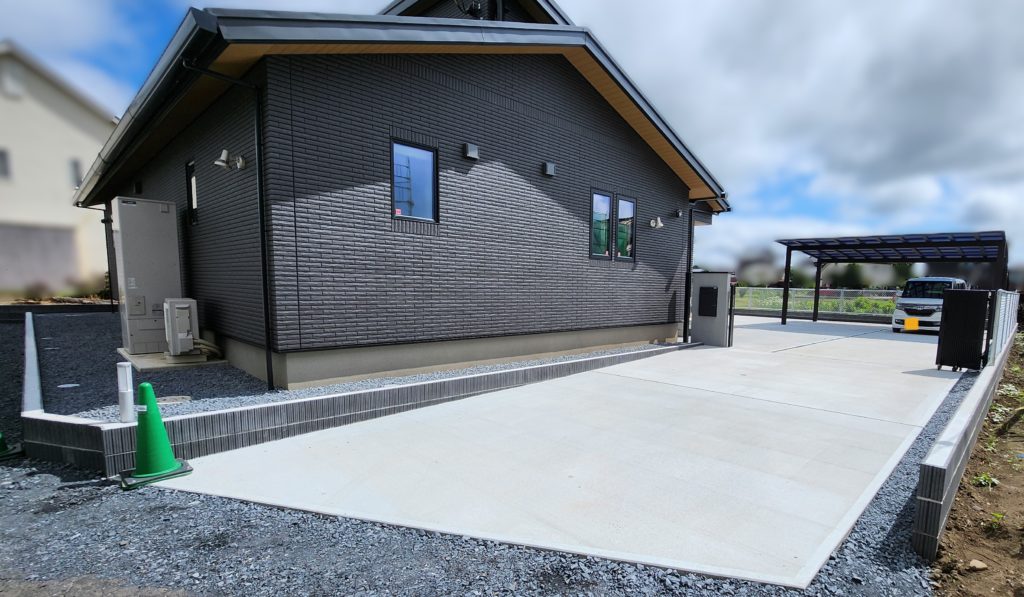 駐車場に土間コンクリート・アプローチを打設して、縦連棟カーポートを設置しました。 リビング前にはウッ […]